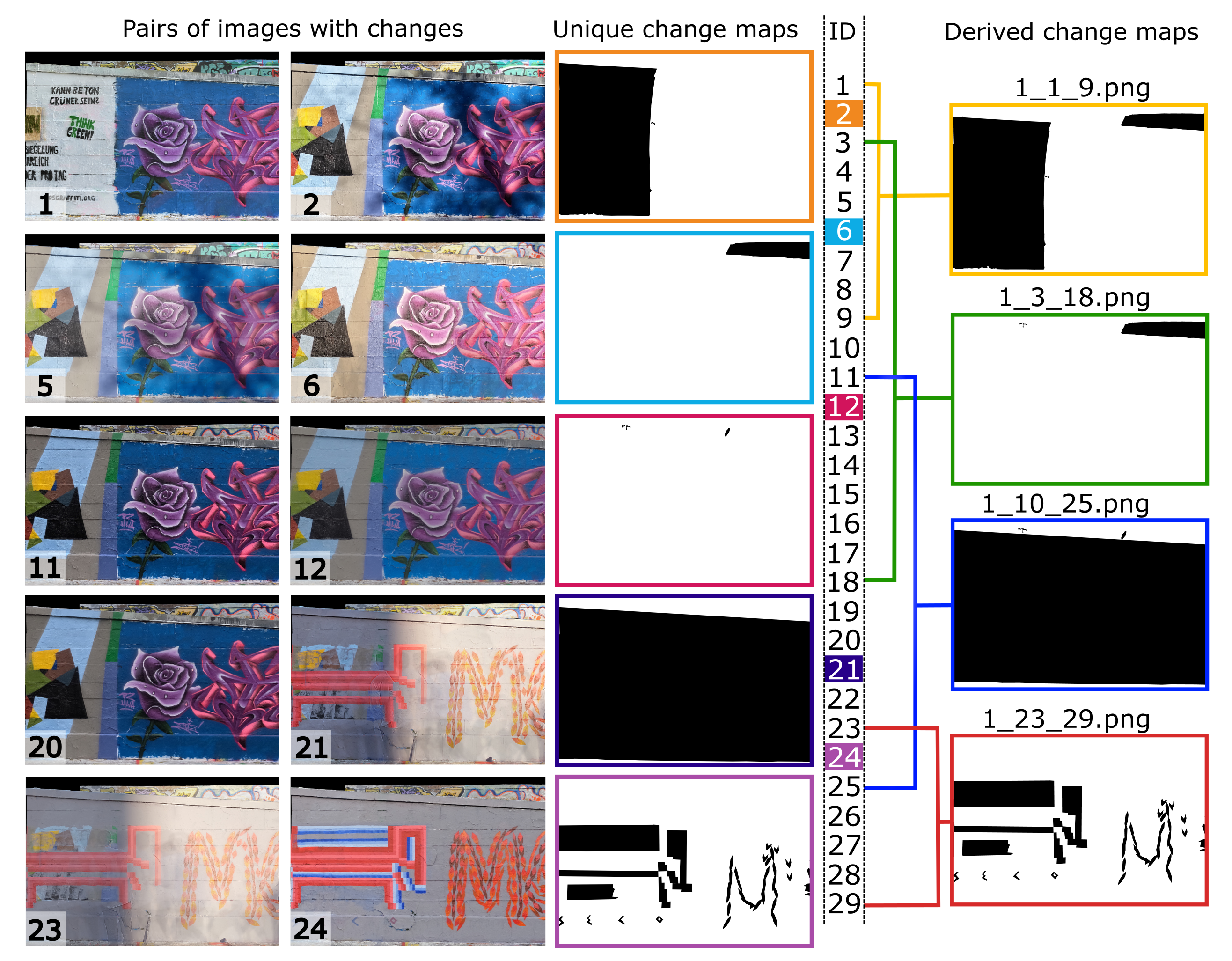 - The corresponding binary reference change map depicting the graffiti-related differences between the two images ("X_YZ.png"). Black areas denote new graffiti (i.e. "change"), and white denotes "no change". "DataStructure.png" provides a visual explanation concerning the creation of the dataset.