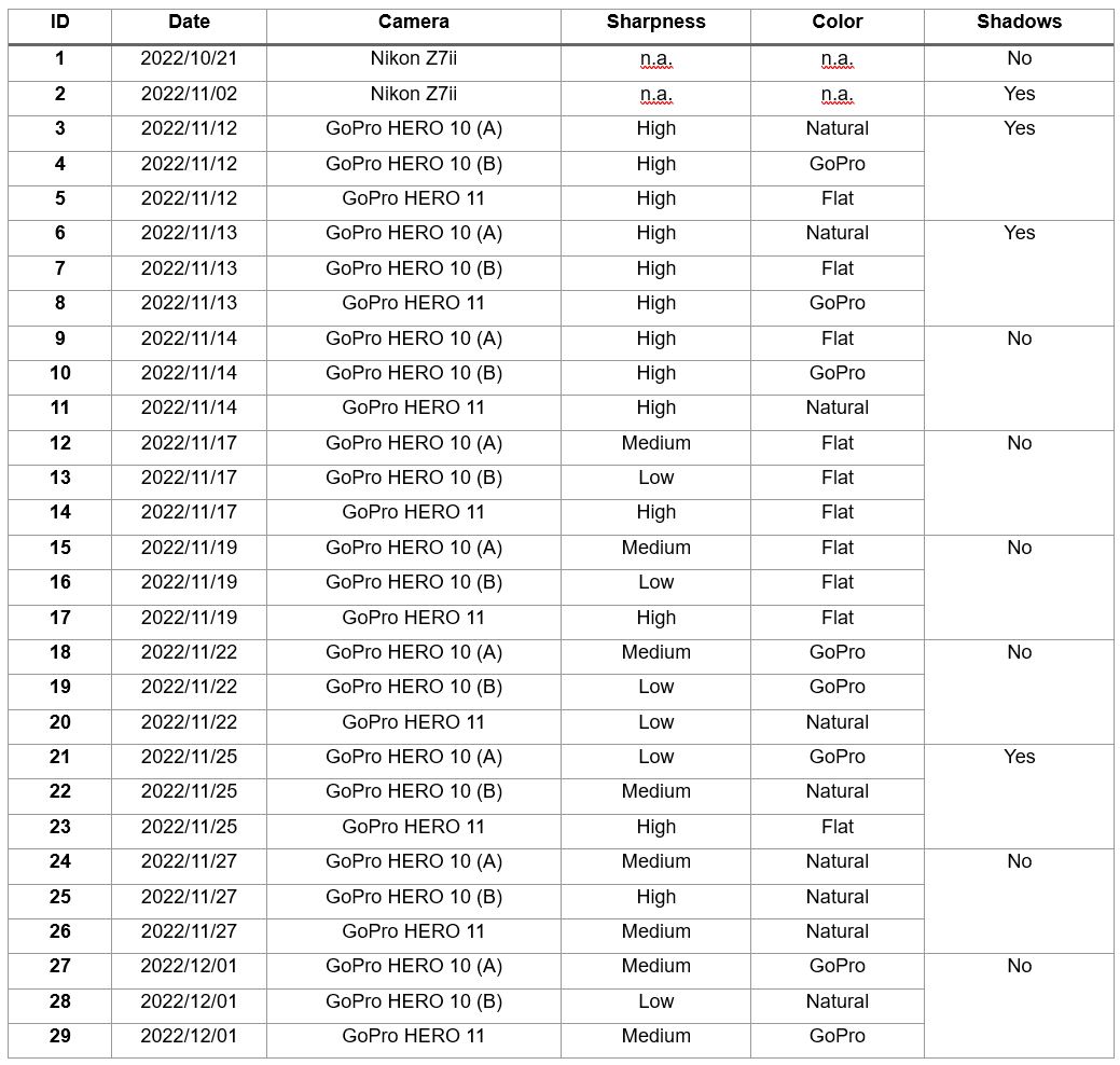 Image acquisition involved the use of two different camera setups. The first two datasets (ID 1 and 2; cf. "EpochIDs.jpg") were obtained using a Nikon Z 7II camera with a pixel count of 45.4 MP, paired with a Nikon NIKKOR Z 20 mm lens. For the remaining image datasets (ID 3-29), a triple GoPro setup was employed. This triple setup featured three GoPro cameras, comprising two GoPro HERO 10 cameras and one GoPro HERO 11, all securely mounted within a frame. This triple-camera setup was utilised on nine different days with varying camera settings, resulting in the acquisition of 27 image datasets in total (nine days with three datasets each).